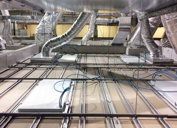 This required careful planning and coordination to contain demolition noise and dust and remove debris while preventing contamination and interruption to active production areas. We devised ways to move new materials and trade workers in and out of construction areas without disrupting nor contaminating clean production areas, scheduled limited shutdowns of power and remapped production paths, and built temporary isolating walls and corridors to separate construction from the rest of the active facility. Go to next page for more information and photos.